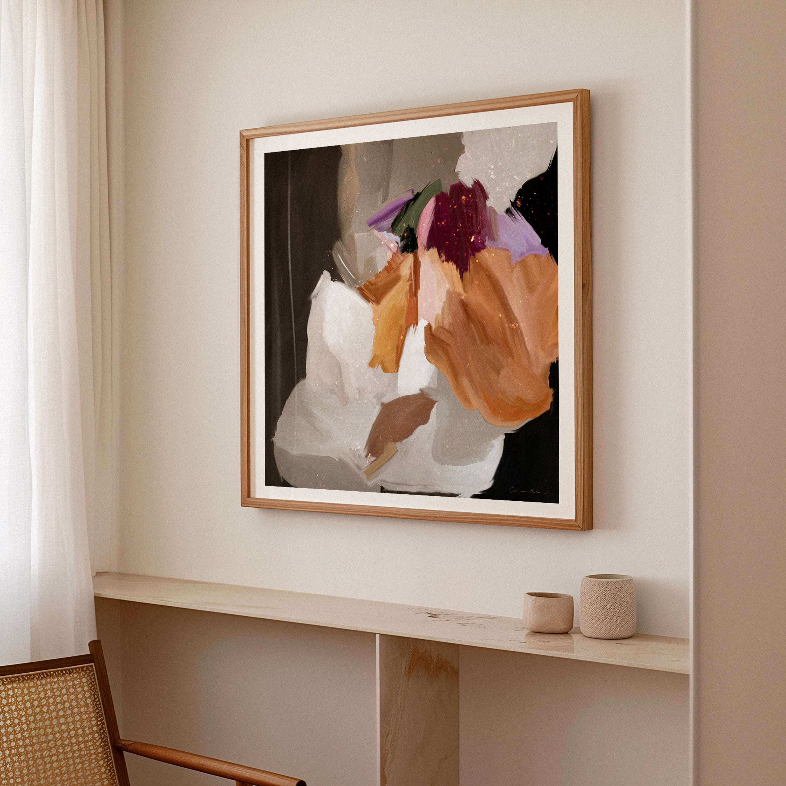 Every artwork is completed with a hand-crafted timber frame, designed to complement both the piece and its surrounding space.