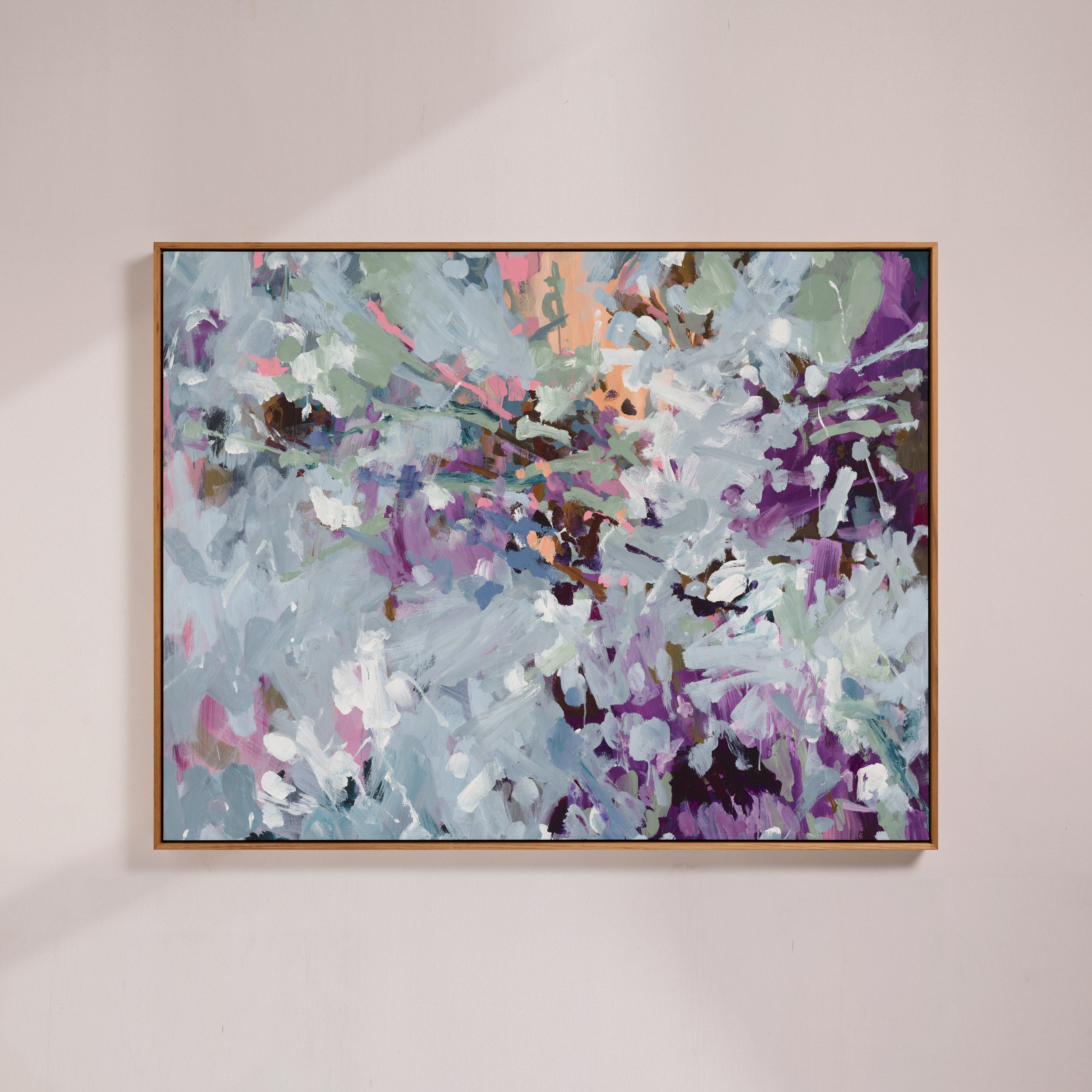 Canvas artworks are stretched and finished within a floating (shadow-box) frame, leaving a subtle shadow gap between the edge of the canvas and the frame. This design allows the artwork to appear as if it is gently suspended inside the frame, creating a clean, modern profile that elevates the piece without distraction.