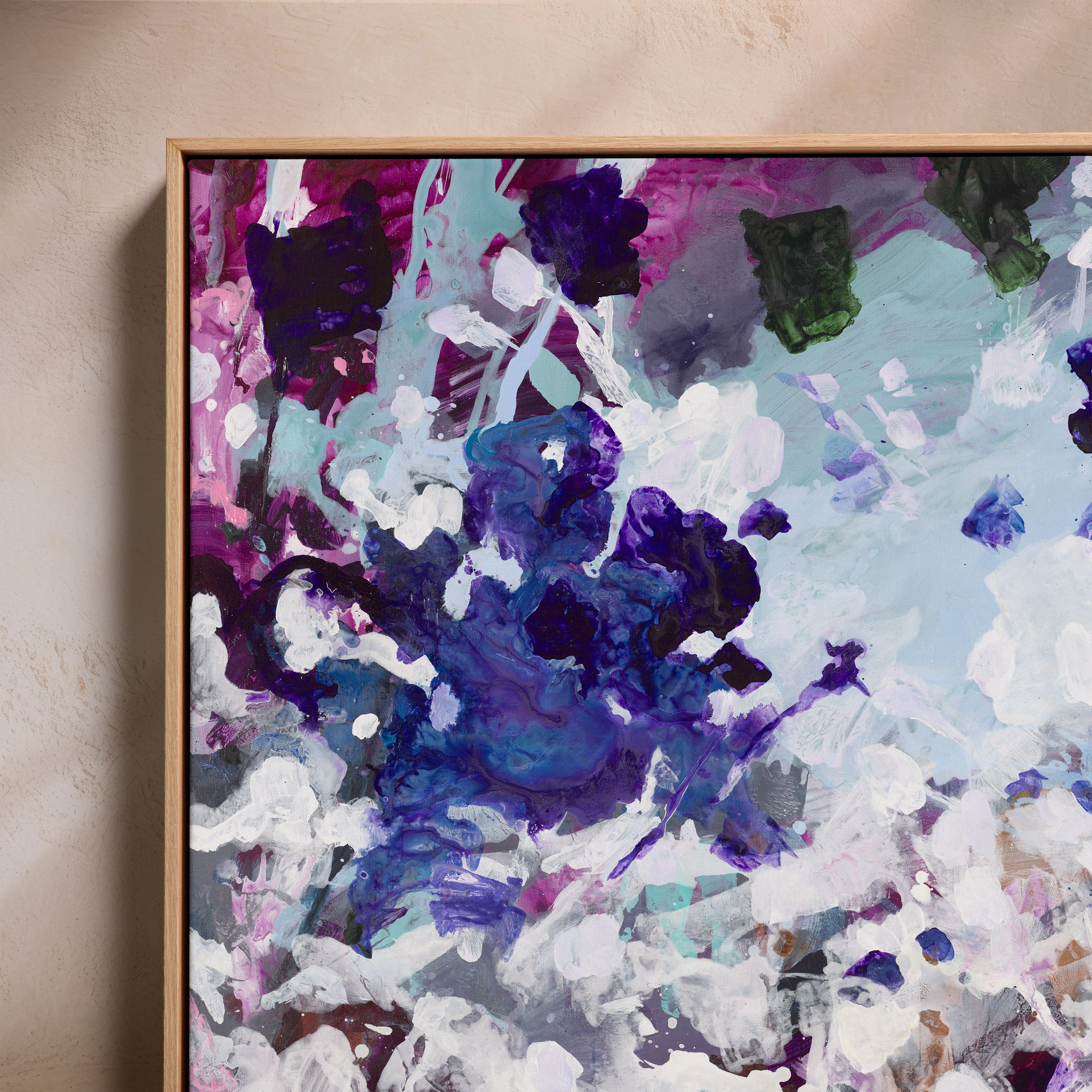 Canvas artworks are stretched and finished within a floating (shadow-box) frame, leaving a subtle shadow gap between the edge of the canvas and the frame. This design allows the artwork to appear as if it is gently suspended inside the frame, creating a clean, modern profile that elevates the piece without distraction.