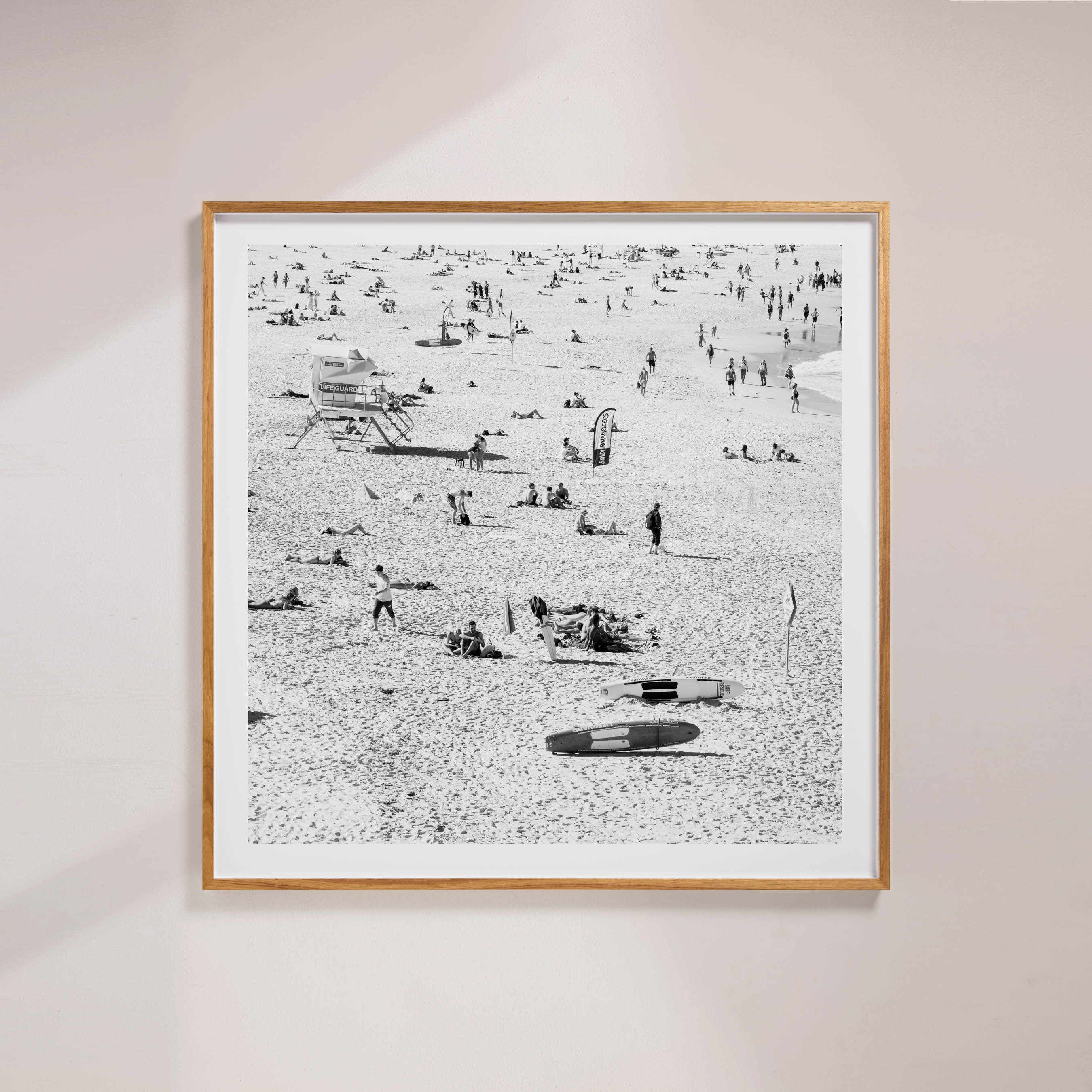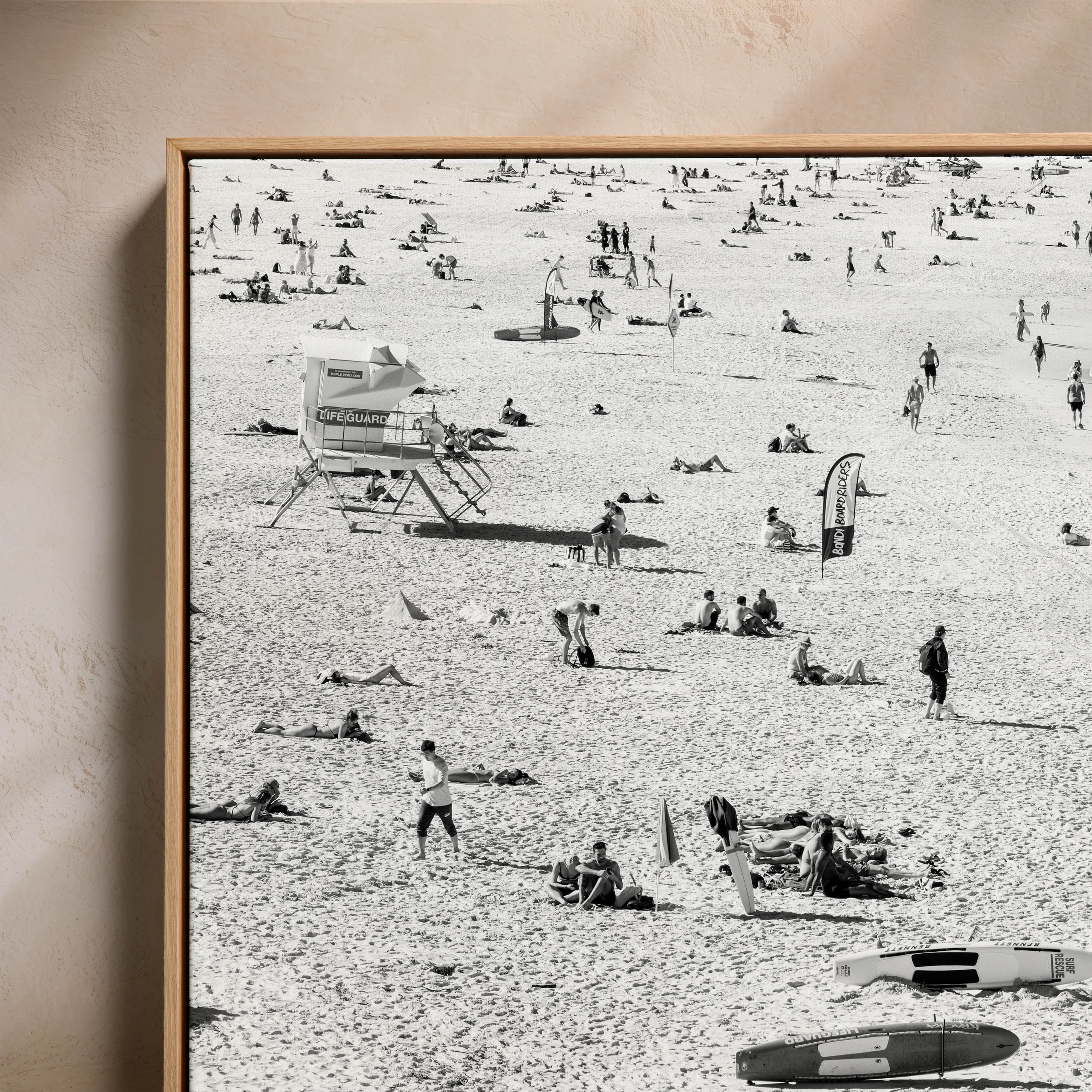 Bondi Guard Tower captures the lively essence of Sydney's Bondi Beach, with a focus on the iconic lifeguard tower. This vibrant photograph shows sunbathers and surfers enjoying a sunny day, with the lifeguard tower standing watch over the beach.