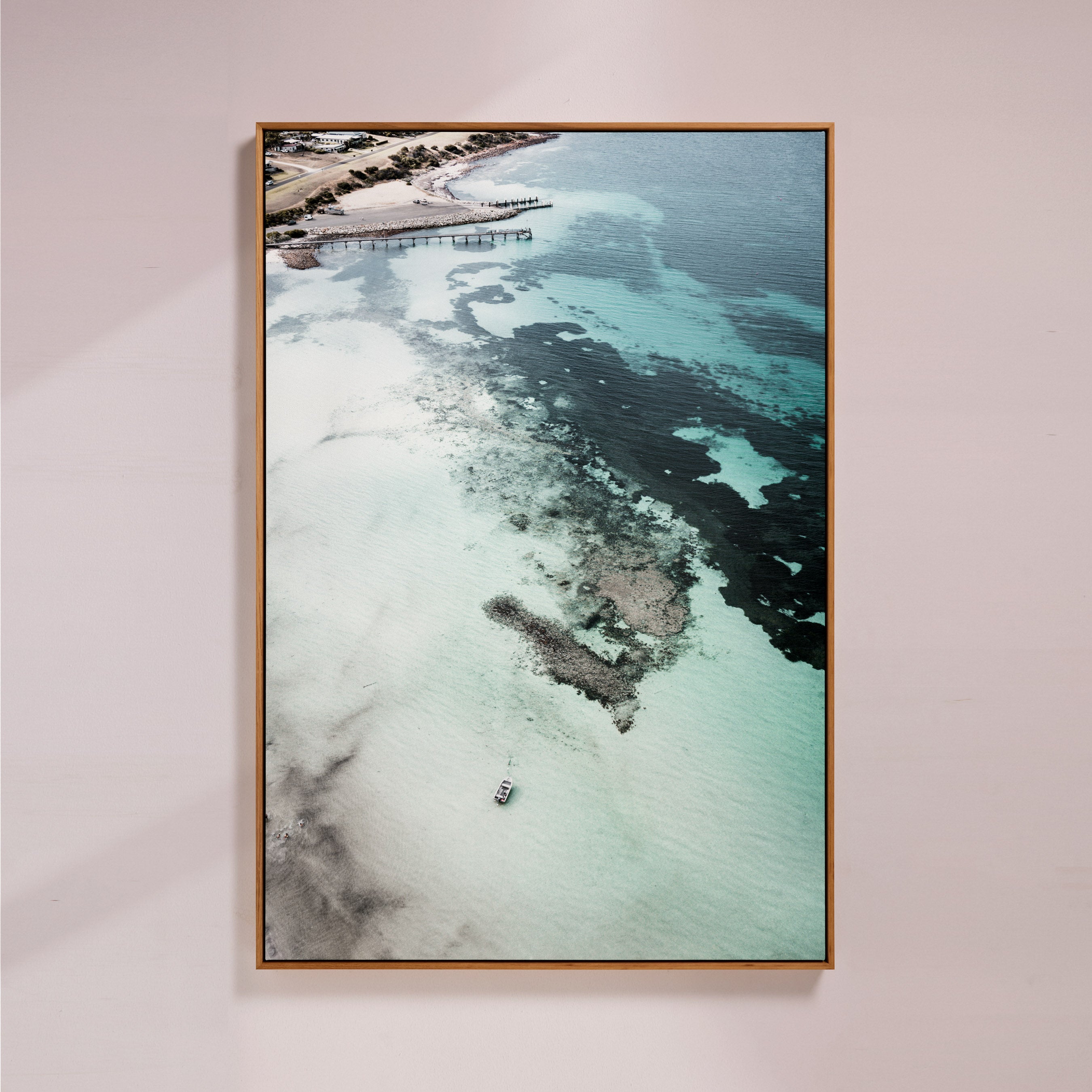 Canvas artworks are stretched and finished within a floating (shadow-box) frame, leaving a subtle shadow gap between the edge of the canvas and the frame. This design allows the artwork to appear as if it is gently suspended inside the frame, creating a clean, modern profile that elevates the piece without distraction.